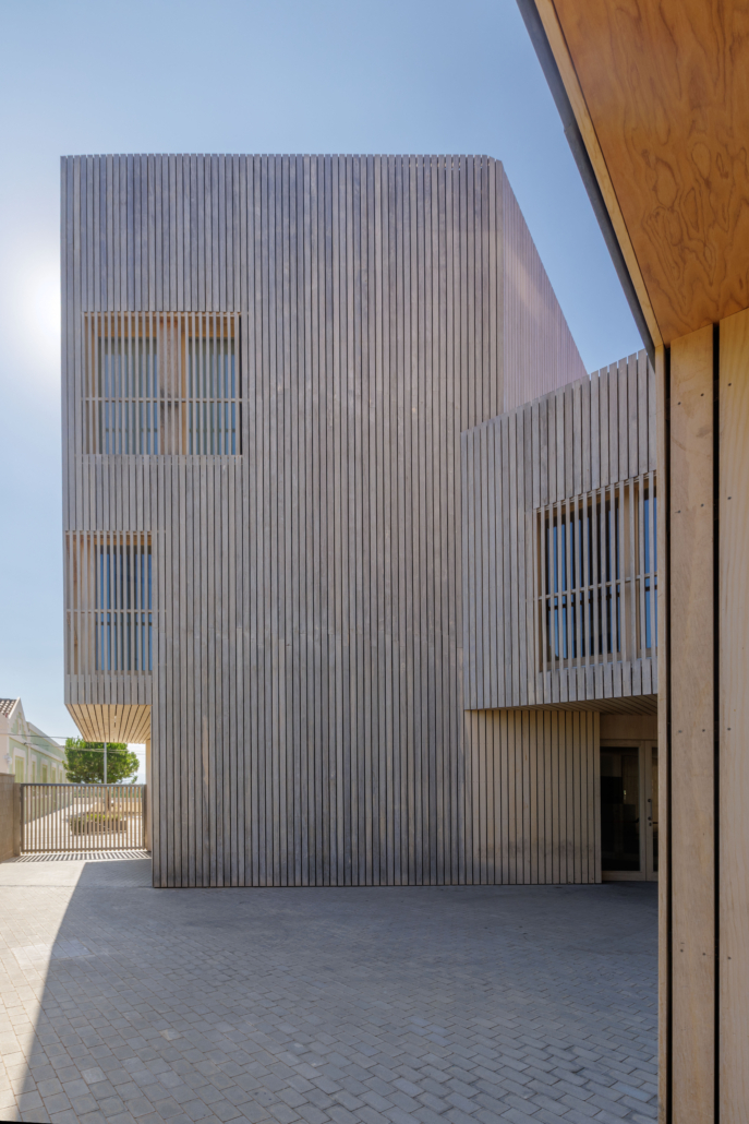 La façana lateral és la més alterada de l’edifici històric. El nou edifici pretén relacionar-se subtilment amb ella, alliberant-la al màxim sense perdre les relacions funcionals i la qualitat espaial que es genera en els punts de relació. Es proposa la rehabilitació de l’edifici històric mantenint els seus valors patrimonials. Es manté l’essència del Casal tradicional amb el seu caràcter eclèctic, de manera que el teatre sigui reconegut com un referent de memòria històrica pels canongins. Que formalment al casal li passi el mínim però que funcionalment arribi al màxim, conservant una arquitectura del passat i obtenint un equipament amb requeriments tècnics actuals.