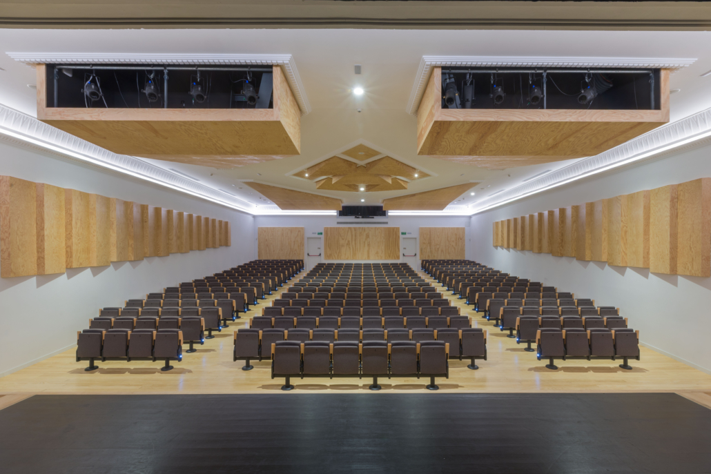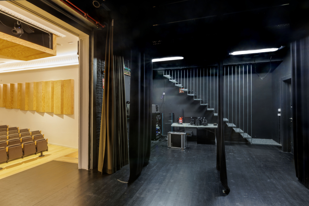 La falta d’espais i requeriments tècnics per les activitats escèniques es resol adossant a la part posterior de la caixa escènica un annex que amb el mateix llenguatge arquitectònic de tota l’actuació, dota de nous camerinos, d’una zona comuna d’artistes, d’una entrada nova amb muntacàrregues de material per l’escenari i d’un espai per instal·lacions. Aquesta actuació permet alliberar els laterals de l’escenari, augmentar l’alçada de caixa escènica i ubicar una pinta tècnica accessible.